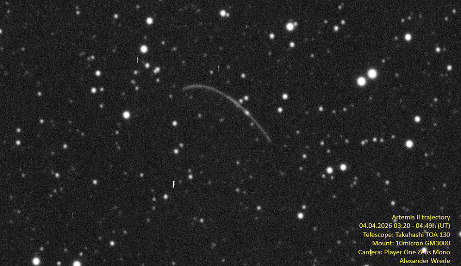 ESSEN: Alexander Wrede von der Walter-Hohmann-Sternwarte dokumentiert spektakulären Flugverlauf – Aufnahme zeigt perspektivisch gekrümmte Bahn durch Erddrehung In der aktuellen Pressemitteilung der der Sternwarte heisst es weiter: „Ein außergewöhnliches astronomisches Ereignis ist dem Essener Astrofotografen Alexander Wrede gelungen: Der langjährige Beobachter und Mitglied der Walter-Hohmann-Sternwarte Essen filmte am Samstagmorgen, 4. April 2026, von Spanien aus die Orion-Raumkapsel der Artemis-II-Mission während ihres Fluges in Ri... [ Zum Artikel... ]